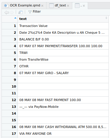 Now we'll run a for loop over all the images we saved above and apply the Tesseract OCR to each one in turn. We'll also save all of the OCR outputs in one consolidated data frame as we go.
