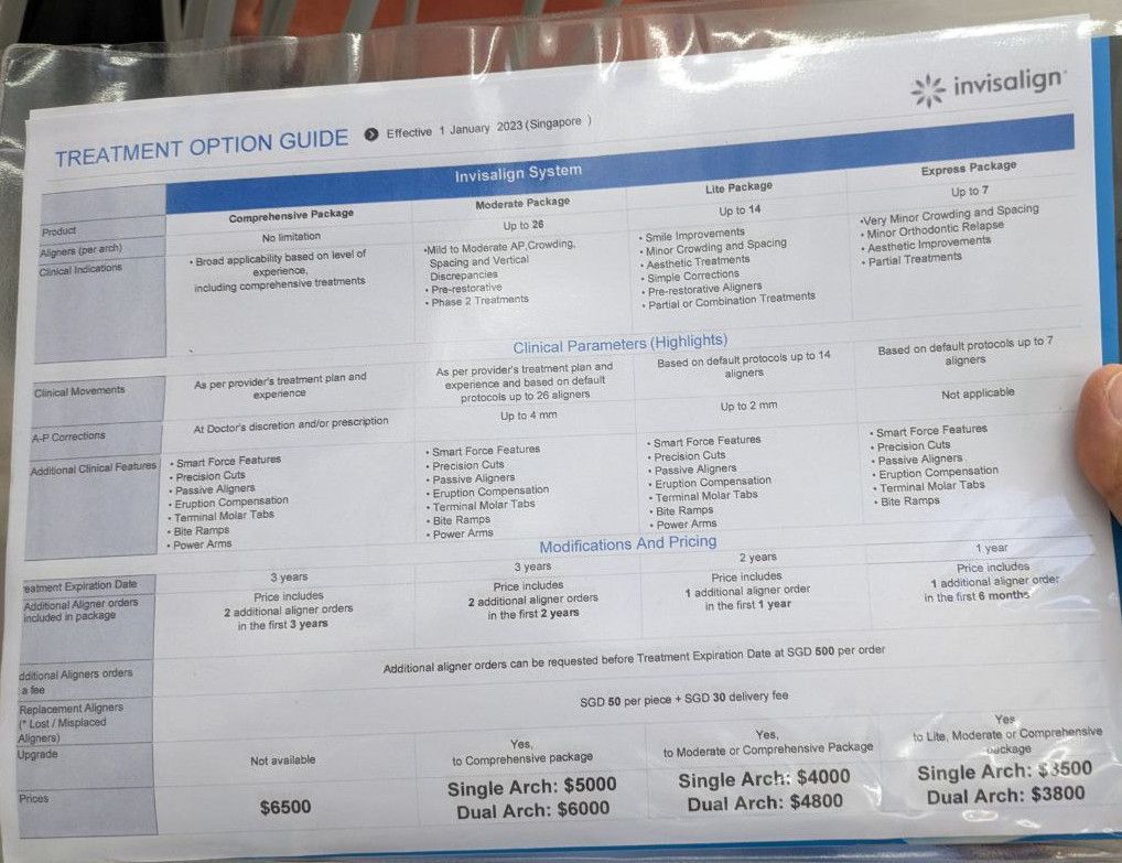 Invisalign offers tiered packages. Minor corrections can get a lower tier, but significant movement will need a higher tier. The lowest tier I could choose from was $3,500 SGD and the highest was $6,500 SGD for a comprehensive plan. The down-payment was $2,000 SGD to enter my scans into the Invisalign system. Replacing lost trays will cost extra.