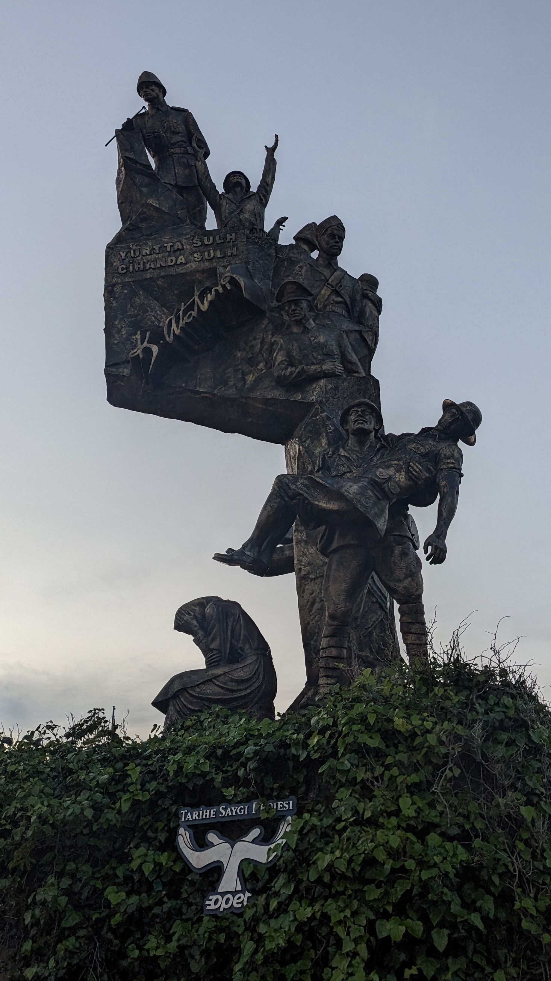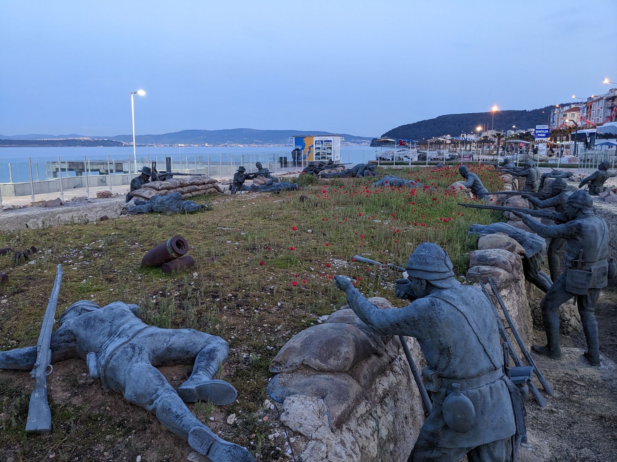 We reached our base at the Boomerang Cafe in Eceabat. We all had beers and swapped war stories. Just before sundown we walked into town to see the monument to the trench fighting between Ottoman and ANZAC forces. The tone of the memorial plaques didn't begrudge the ANZAC soldiers personally, but it did convey the Turk's "brave defence against foreign invaders" narrative of the Dardanelles campaign which is glossed over in Australian schools.