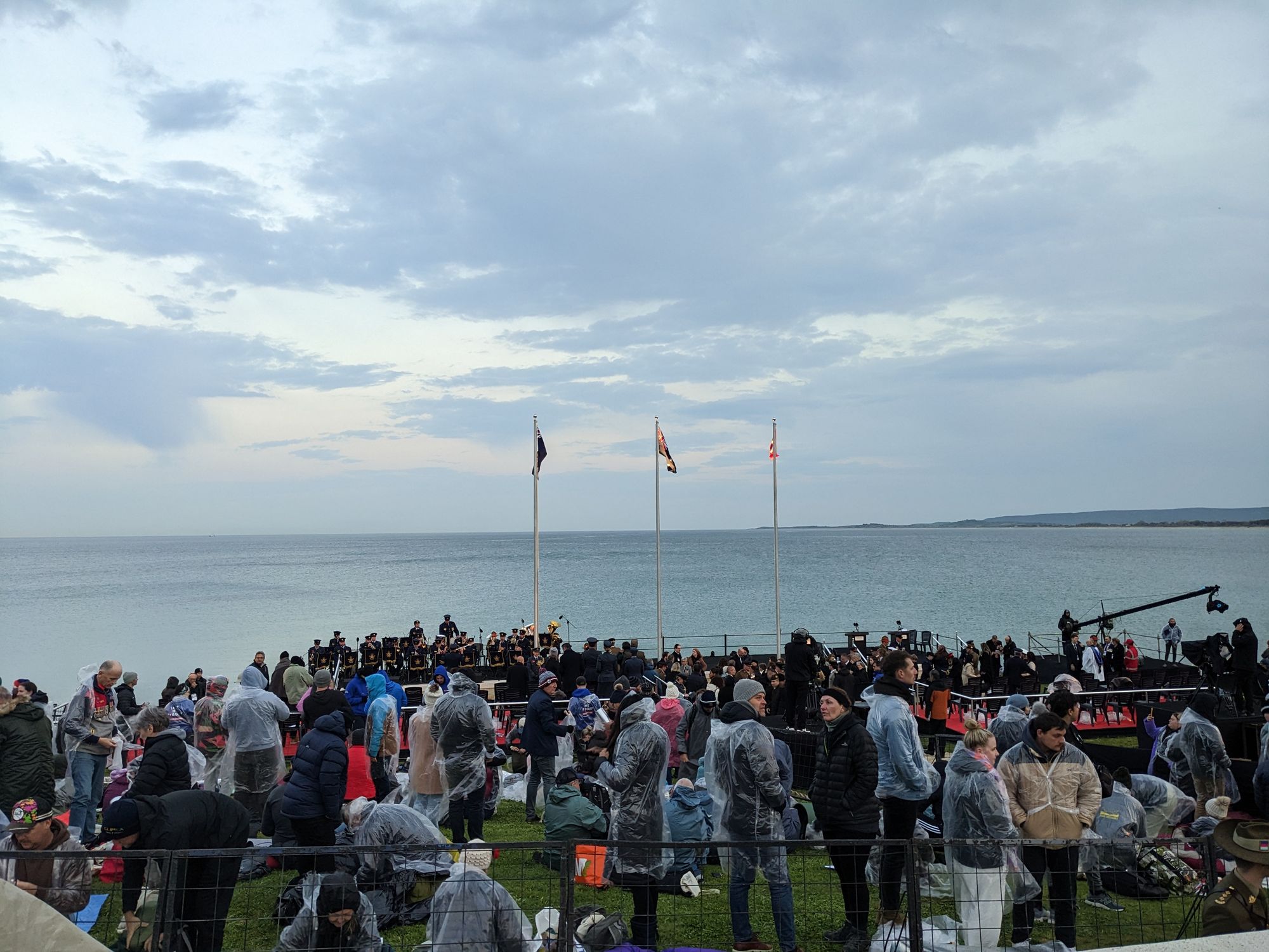 The Dawn Service began with a Karanga, a Māori call to gather by the New Zealand Defence Force, and the playing of the didgeridoo by the Australian Defence Force. The Master of Ceremonies introduced the Catafalque of Australian, New Zealand and Turkish military officers to honour the dead. There were readings, addresses and hymns. The band played the Last Post, we observed a minute of silence, and we closed with all three nations' national anthems. As we closed, a light downpour began but quickly gave way to a dry, overcast morning.
