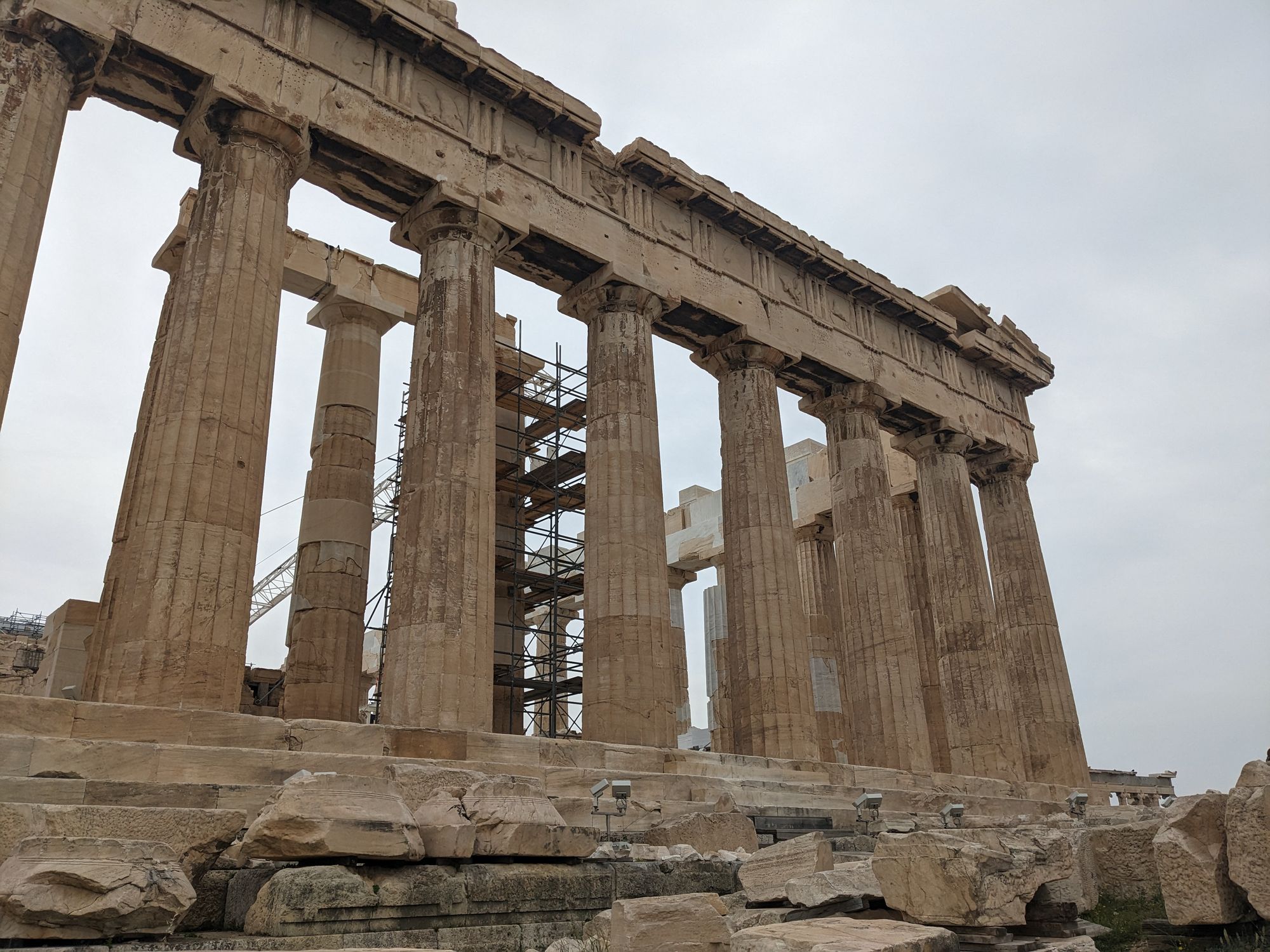 Past the entrance lies the Erechtheion, a temple dedicated to Athena and Poseidon. It is famous for its Caryatids - six sculpted female figures that support the roof. If the figures were male, they'd be called telamones or atlantes.